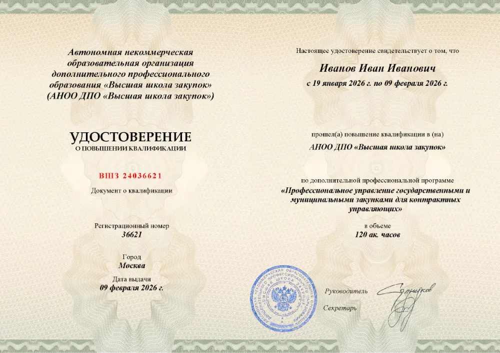 Вы получаете официальное удостоверение о повышении квалификации. Высшая школа закупок (fz44.org) обеспечивает передачу данных в реестр ФИС ФРДО, подтверждая соответствие вашей подготовки во Владимире требованиям Минтруда.