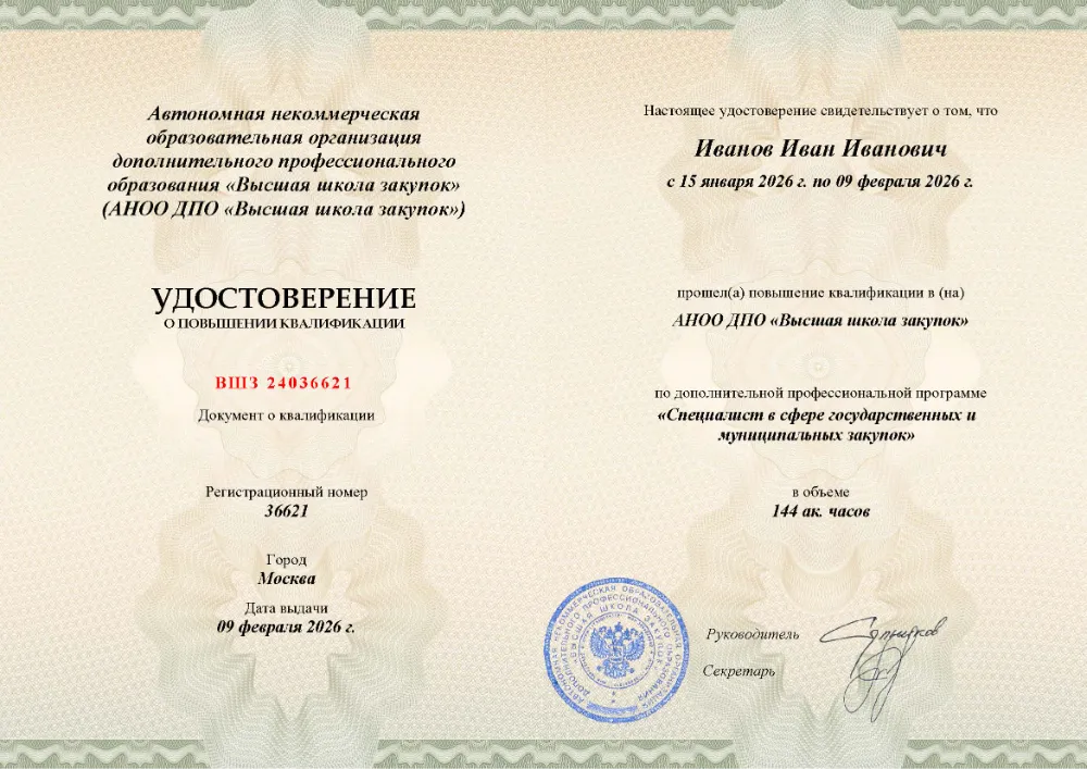 Вы получаете официальное удостоверение о повышении квалификации. Высшая школа закупок (fz44.org) в обязательном порядке вносит сведения об обучении во Владимире в реестр ФИС ФРДО, подтверждая легитимность вашей подготовки перед контролерами.